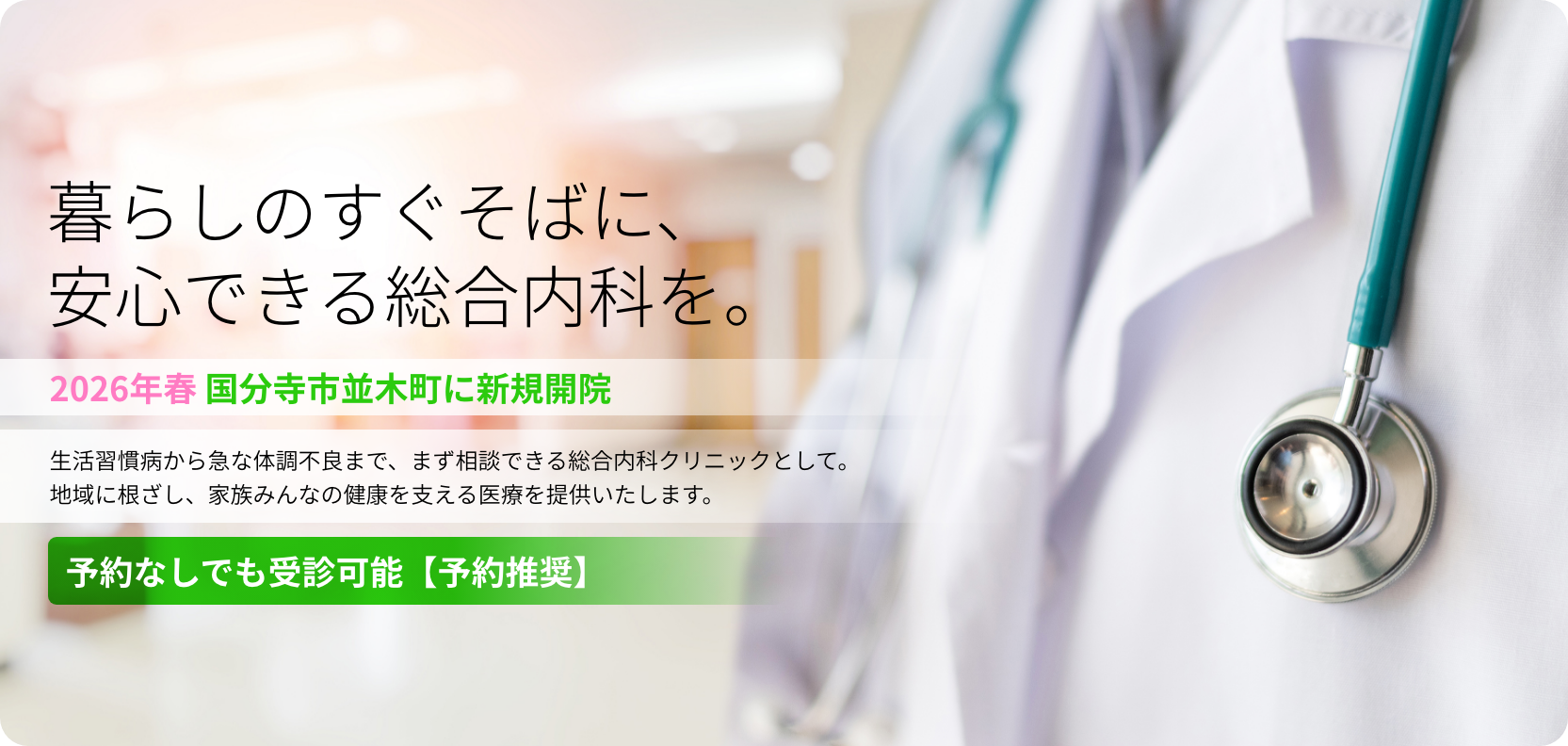 このたび「国分寺なみき内科クリニック」を開院することとなりました、院長の鈴木 愛(すずき めぐみ)と申します。